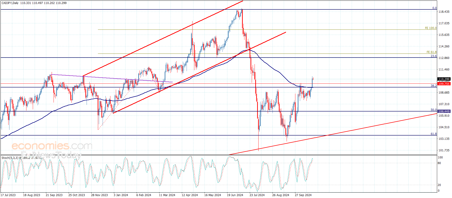 تمركز مؤشر ستوكاستيك حاليا ضمن مستوى تشبع الشراء قد يجبر السعر على تقديم ارتداد سلبي مؤقت ليختبر مستوى 109.75 ومن ثم ليبدأ بتفعيل المسار الصاعد ليستهدف بذلك المحطات الإيجابية الإضافية والتي تتمركز قرب 111.10 و111.75 على التوالي.