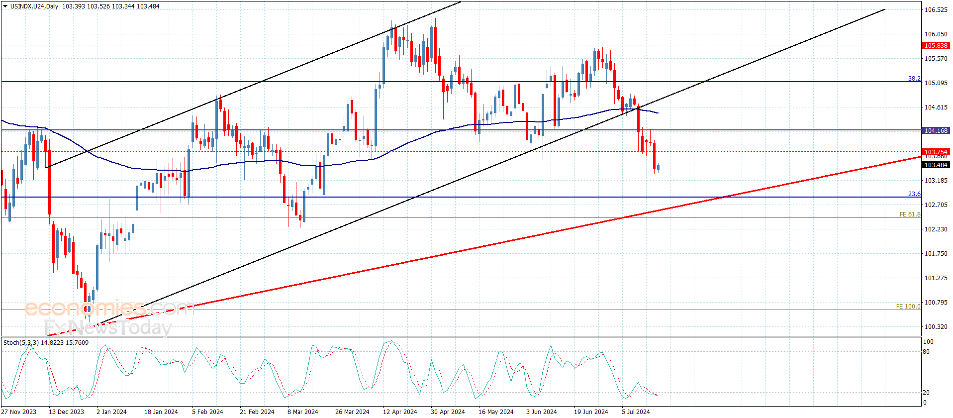 نجح سعر المؤشر باستئناف الهجوم السلبي بتحقيقه لكسر مستوى 103.75 ليهبط مباشرة نحو الهدف الإضافي الأول المستقر عند 103.35 وليستقر قربه.