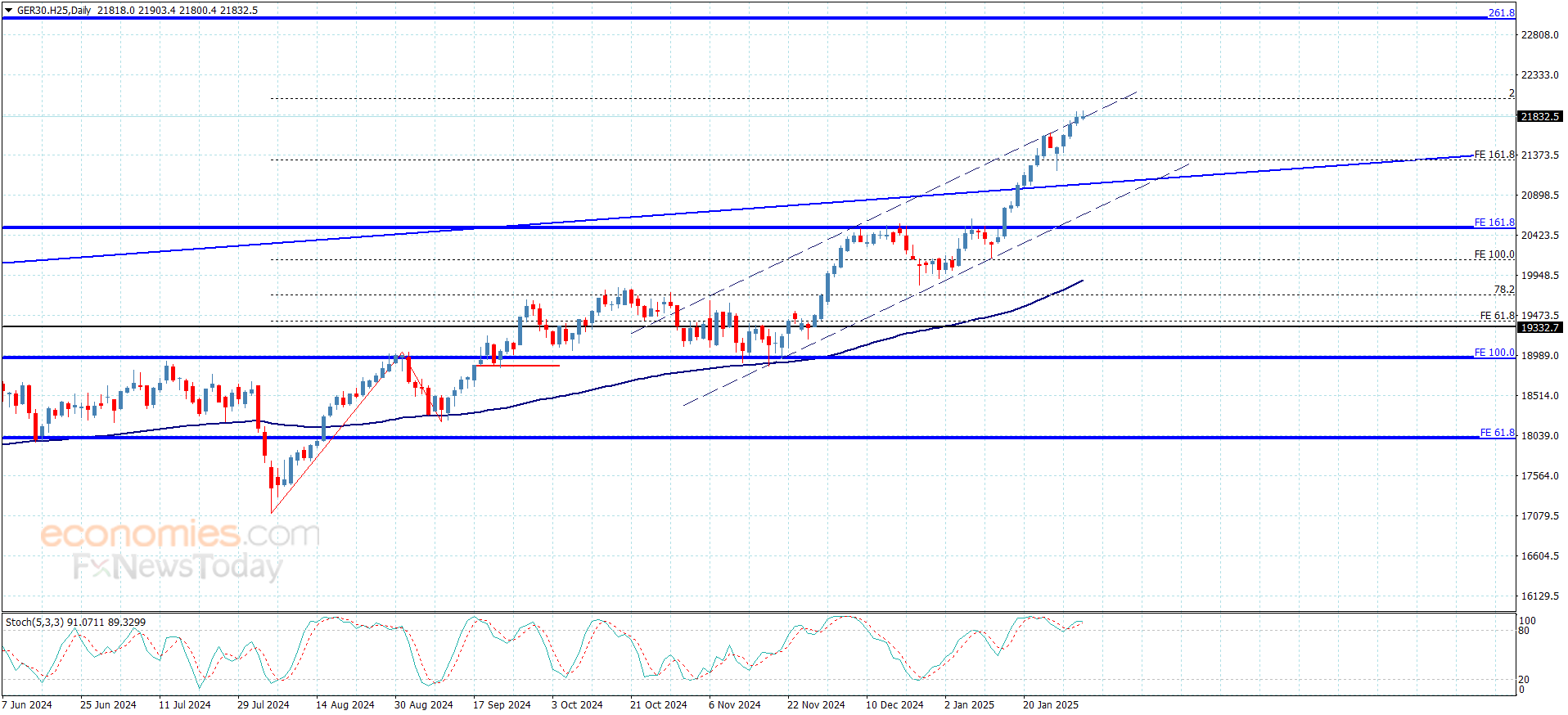 نجح سعر المؤشر باستقبال العزم الإيجابي الإضافي نتيجة لاقتراب مؤشر ستوكاستيك من مستوى 80 لنلاحظ من الرسم المرفق بدء تشكيله لموجات صاعدة واقترابه حاليا من الهدف الأول المستقر عند 21730.00.