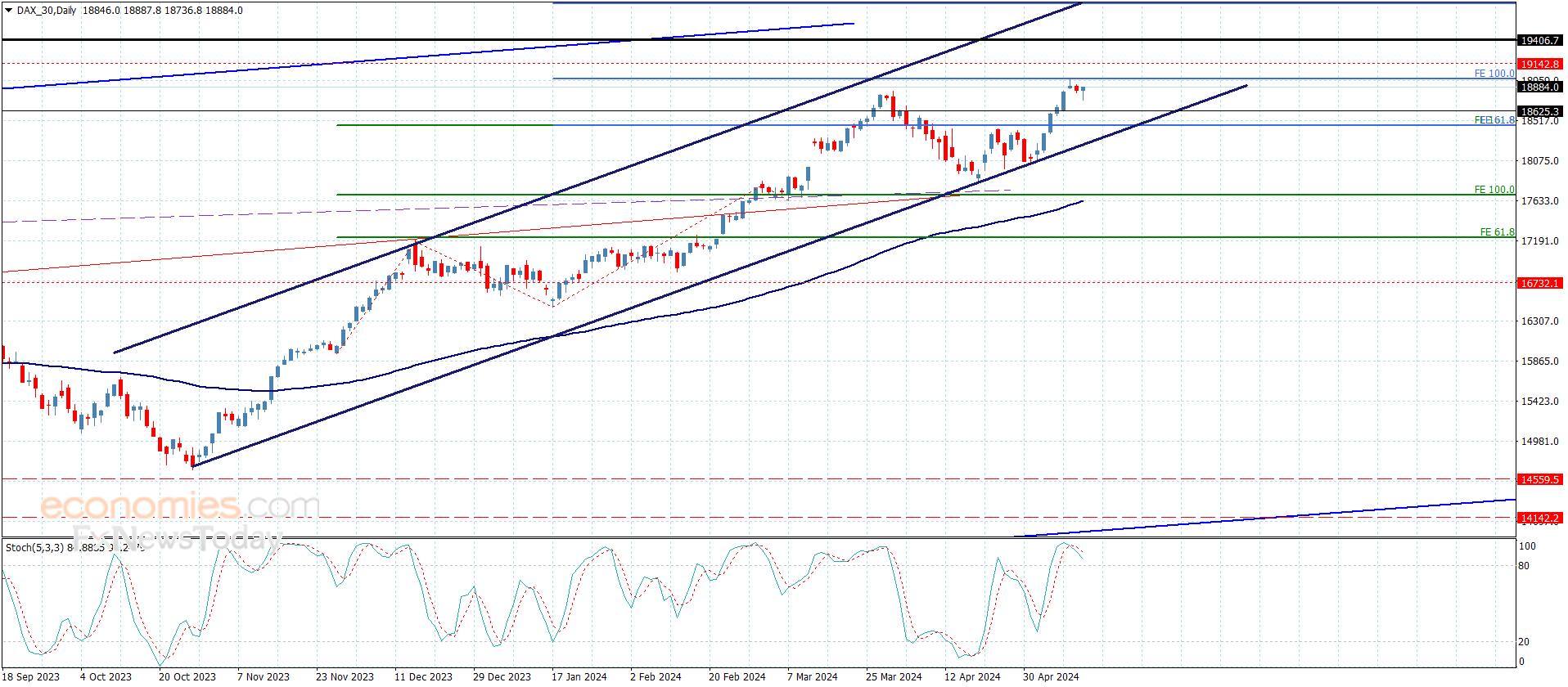 - بالرغم من تذبذب سعر المؤشر خلال الفترة الأخيرة دون الحاجز المتمثل بمستوى 18970.00، إلا أن استقراره العام ضمن محاور القناة الصاعدة وصموده فوق الدعم الإضافي المتمركز عند 18625.00 يدعم فرضية انتظار تحقيقه لاختراق الحاجز الحالي، مما سيفتح باب الوصول نحو المحطات الإيجابية الإضافية والتي قد تبدأ من 19125.00 و19410.00 على التوالي.