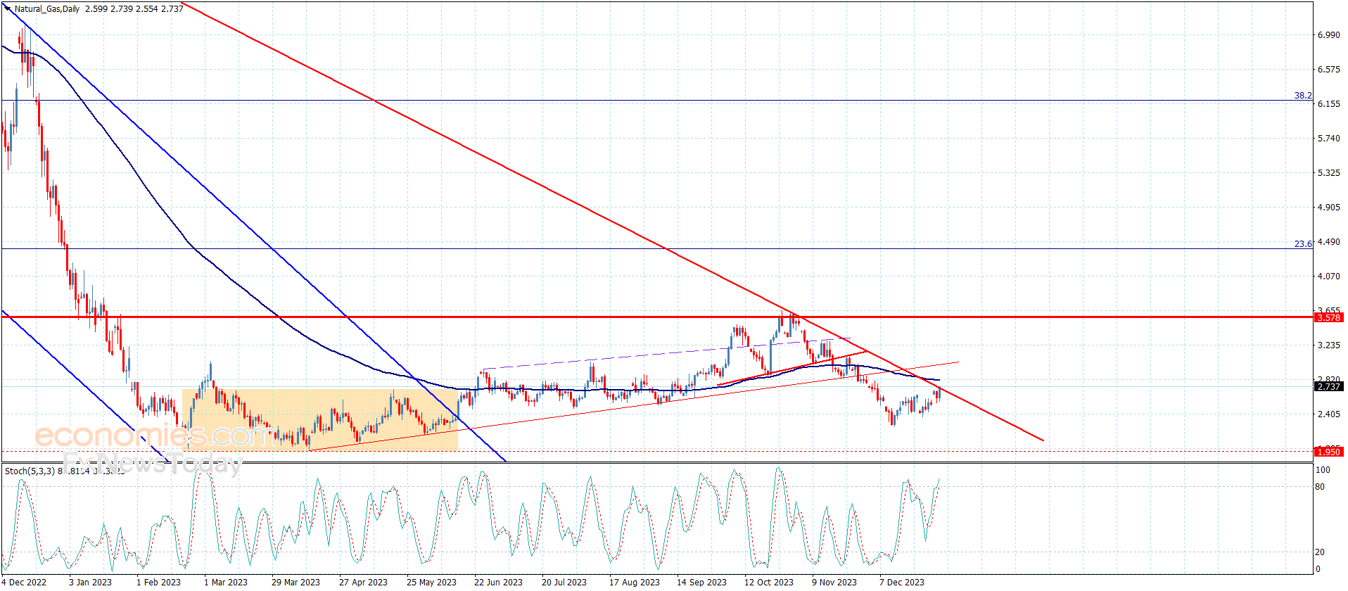تفاعل سعر الغاز يوم أمس مع إيجابية مؤشر ستوكاستيك المتمركز ضمن مستوى تشبع الشراء لنلاحظ تجديد الضغط على المقاومة الرئيسية الممتدة نحو 2.700 بهدف إيجاد منفذ للانتقال للمسار الصاعد من جديد.