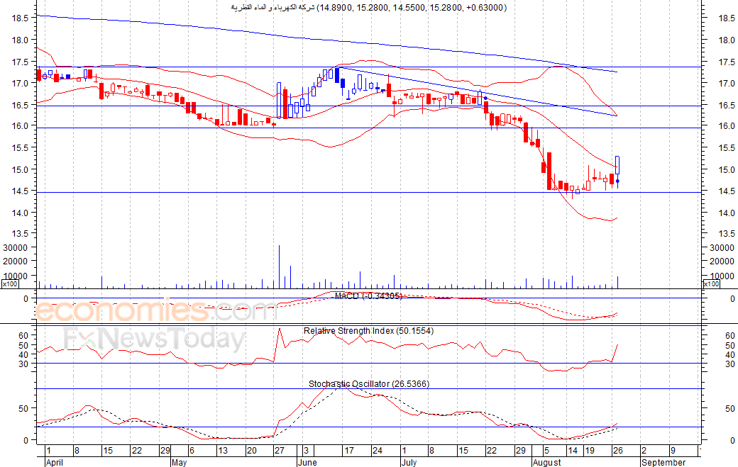 تمكن السهم من الارتفاع امس الثلاثاء ليغلق عند اعلى مستوى له خلال الجلسة وهو 15.28 ريال، وذلك على خلفية ملامسته لمستوى الدعم 14.50 ريال، لينجح بذلك السهم في تجاوز متوسطه المتحرك لـ 20 يوم، لذلك نتوقع ان يمدد السهم مكاسبه للوصول لمستوى المقاومة 16 ثم 16.50 ريال كمستوى ثان، شرط بقاء السهم اعلى مستوى 14.50 ريال.