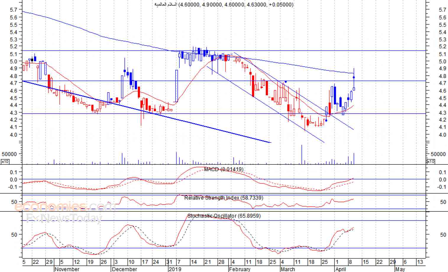 سجل السهم ارتفاع خلال جلسة امس الأربعاء عند 4.90 ريال، الا انه قلص مكاسبه واغلق عند مستوى 4.63 ريال، ويلامس السهم حاليا متوسطه المتحرك لـ 200 يوم، والذي يشكل مقاومة قوية نتوقع ان تضغط على السهم لاسفل في عملية جني أرباح قد تصل به لمستوى الدعم 4.25 ريال كمستوى اول، شرط بقاء السهم اسفل مستوى 4.90 ريال.