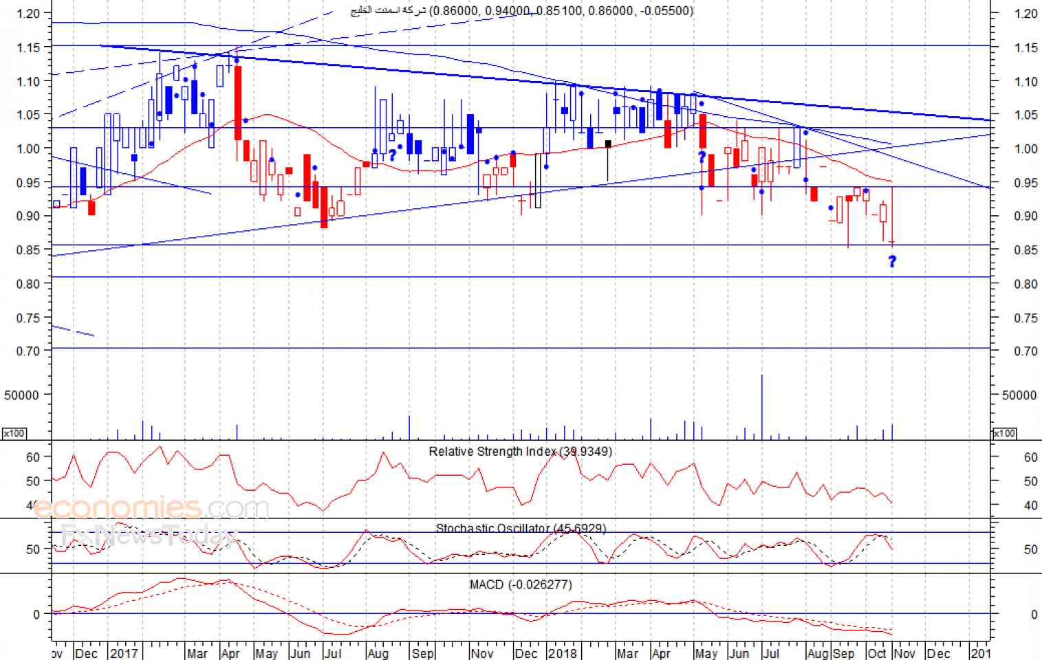 ومتوقع ان يكون النطاق السعري خلال جلسة اليوم بين مستوى الدعم هو 0.84 درهم  وبين مستوى المقاومة هو 0.90 درهم