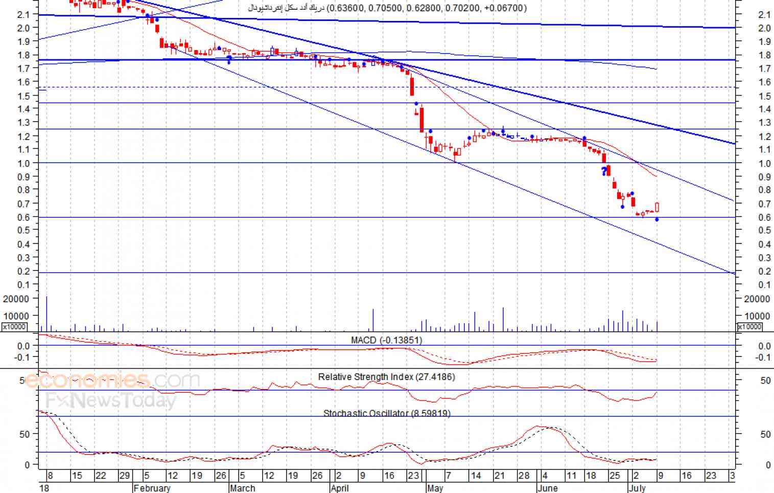 سيطرت القوى الشرائية على تداولات السهم خلال جلسة أمس الاثنين، حيث اغلق عند مستوى 0.702 درهم مرتفعا، وذلك بعدما تلقى دعما عند مستوى 0.60 درهم، مصحوبا بارتفاع في كمية التداول، وهو ما يعد إشارة إيجابية، كما يتداول مؤشر استوكاستيك في منطقة البيع المبالغ فيه، مما يشير الى ان السهم قد يشهد حركة تصحيحية لأعلى لمستوى المقاومة 1 درهم، شرط استقرار السهم أعلى مستوى 0.60 درهم.