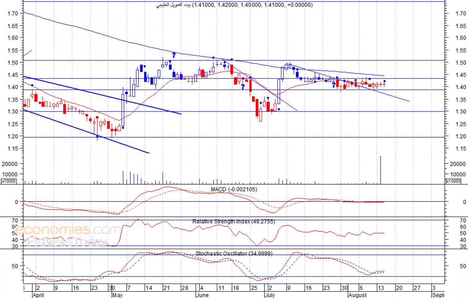 ومن المتوقع ان يكون النطاق السعري خلال جلسة اليوم بين مستوى الدعم هو 1.39 درهم وبين مستوى المقاومة هو 1.42 درهم