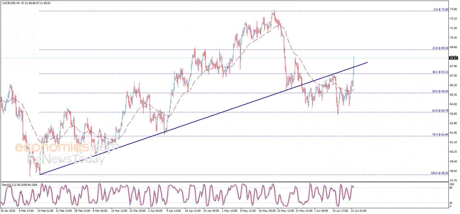 اندفع سعر النفط صعوداً بشكل قوي ليخترق مستوى 67.20 ويتجاوز حاجز 68.00 دولار، ليتم تفعيل سيناريو الاتجاه الصاعد على المدى اللحظي والقصير، حيث يتواجد الهدف الإيجابي التالي عند 69.36، والذي يمثل اختراقه مفتاح امتداد مكاسب النفط لتصل إلى 72.80، في حين سيبقى الارتفاع المتوقع قائماً ما لم يتم كسر مستوى 67.22 والثبات دونه.