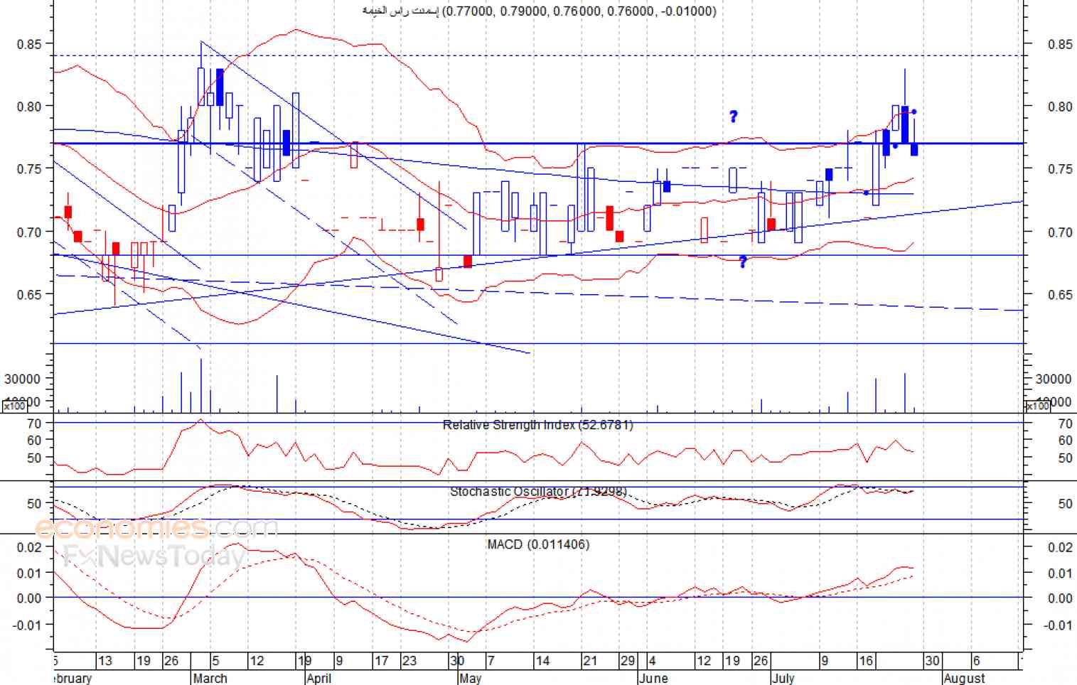 تراجع السهم مرة أخرى لينهي تداولات أمس الاحد أولى جلسات الأسبوع الحالي عند مستوى 0.76 درهم، وذلك بعدما سجل ارتفاع خلال جلسة الخميس 0.83 درهم، مقتربا بذلك من هدفه السعري المتوقع عند 0.84 درهم، ليعود بذلك أسفل مستوى المقاومة 0.77 درهم، مما يعزز إمكانية انخفض السهم اكثر وإعادة اختبار مستوى الدعم 0.68 درهم كمستوى اول، شرط نجاح السهم في الاستقرار أسفل مستوى 0.80 درهم. ومتوقع ان يكون النطاق السعري خلال جلسة اليوم بين مستوى الدعم هو 0.74 درهم وبين مستوى المقاومة هو 0.77 درهم
