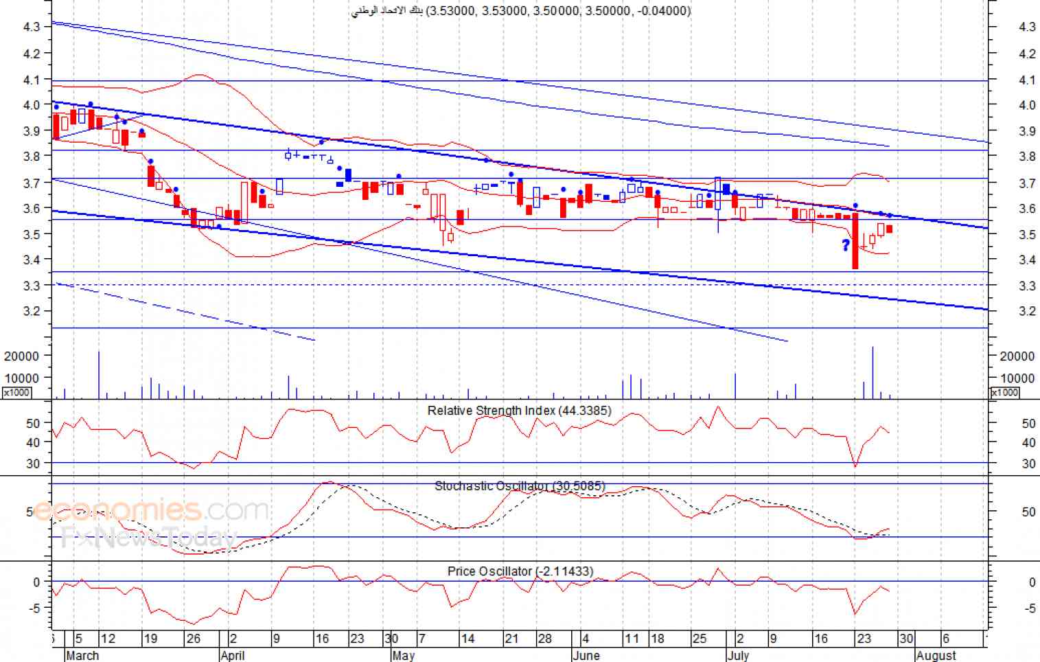 انخفض السهم كما أشرنا في تقاريرنا السابقة، حيث اغلق أمس الاحد عند مستوى 3.50 درهم، وذلك بعدما تلقى مقاومة ناتجة من ملامسته لخط الاتجاه الهابط طويل الأجل، في ظل تدني ملحوظ لكمية لثاني جلسة على التوالي، كما كون السهم نموذج "Bearish Harami " وهو من الشموع اليابانية العاكسة للاتجاه الصاعد، لذلك نتوقع ان ينخفض السهم مرة أخرى لمستوى الدعم 3.35 درهم كمستوى اول، شرط ثبات السهم أسفل مستوى 3.60 درهم. ومتوقع ان يكون النطاق السعري خلال جلسة اليوم بين مستوى الدعم هو 3.48 درهم وبين مستوى المقاومة هو 3.52 درهم