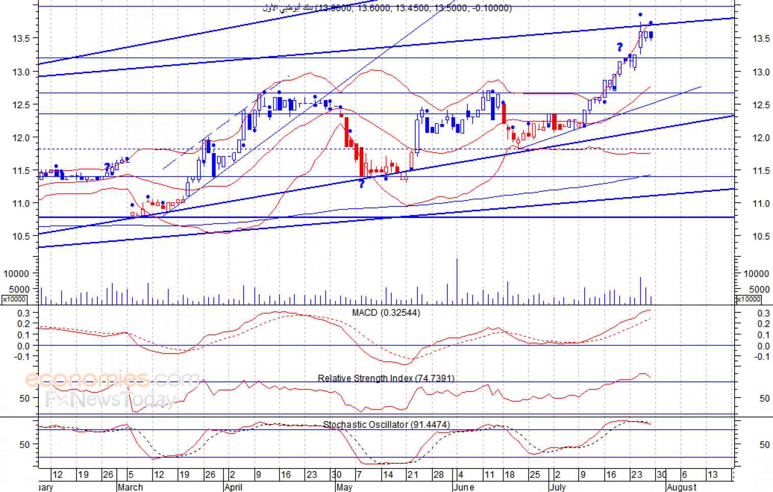 انخفض السهم كما أشرنا في تقريرنا الأخير لينهي تداولات أولى جلسات الأسبوع الحالي أمس الاحد عند مستوى 13.50 درهم، في ظل تدني كمية التداول، وذلك بعدما تلقى مقاومة عند مستوى 13.70 درهم، وبالنظر الى المؤشرات الفنية مثل مؤشر القوة النسبية نلاحظ تداوله في منطقة الشراء المبالغ فيه، وهو ما يشير الى ان السهم قد يواصل عمليات جني أرباح قد تهبط بالسهم لمستوى الدعم 13.20 درهم كمستوى اول ثم 12.70 درهم كمستوى ثان، شرط ثبات السهم أسفل مستوى 13.80 درهم. ومتوقع ان يكون النطاق السعري خلال جلسة اليوم بين مستوى الدعم هو 13.37 درهم وبين مستوى المقاومة هو 13.58 درهم