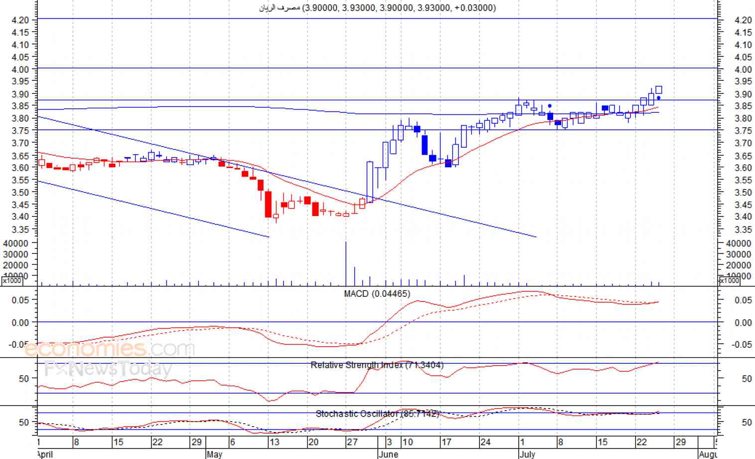 ومن المتوقع ان يكون النطاق السعري خلال جلسة اليوم بين مستوى الدعم وهو 3.91 وبين مستوى المقاومة هو 3.95 ريال