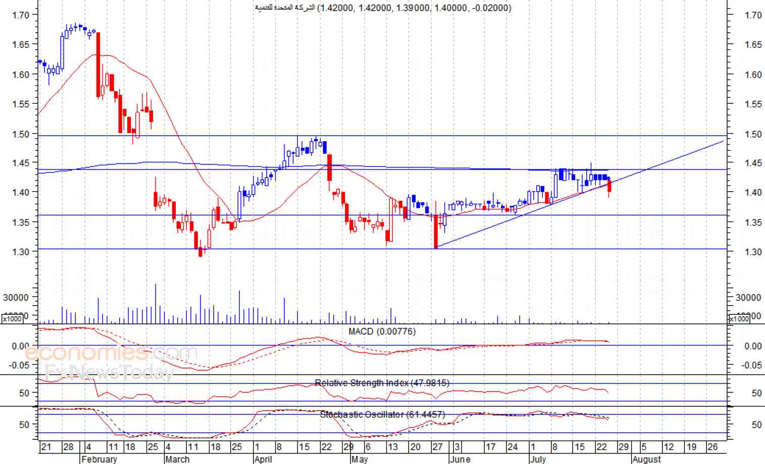 تلقى السهم مقاومة قوية عند مستوى 1.44 ريال، دفعت السهم لاسفل ليغلق عند مستوى 1.40 ريال، لينزلق بذلك اسفل متوسطه المتحرك لـ 20 يوم، وهو ما يعد إشارة سلبية، كما اخترق السهم خط الاتجاه الصاعد قصير الأجل، مما يفتح الباب امام السهم لمزيد من الانخفاض لمستوى الدعم 1.36 درهم كمستوى اول ثم 1.30 ريال كمستوى ثان، شرط بقاء السهم اسفل مستوى 1.45 درهم.
