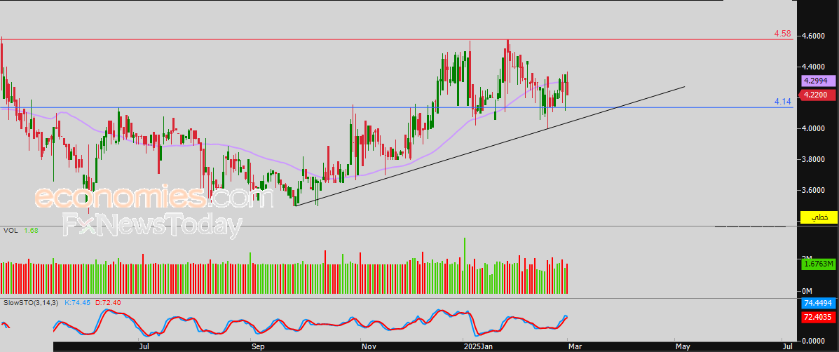 انخفض سعر سهم شركة ريسبونس بلس القابضة (RPM) خلال تداولاته الأخيرة على المستويات اللحظية، وذلك على اثر اصطدامه بمقاومة متوسطه المتحرك البسيط لفترة 50 يوماً السابقة، ليحاول السهم اكتساب زخماً إيجابياً قد يساعده في التخلص من ضغطه السلبي، في ظل سيطرة الاتجاه الصاعد على المدى القصير وتداولاته بمحاذاة خط اتجاه، مع توارد الإشارات الإيجابية بمؤشرات القوة النسبية.