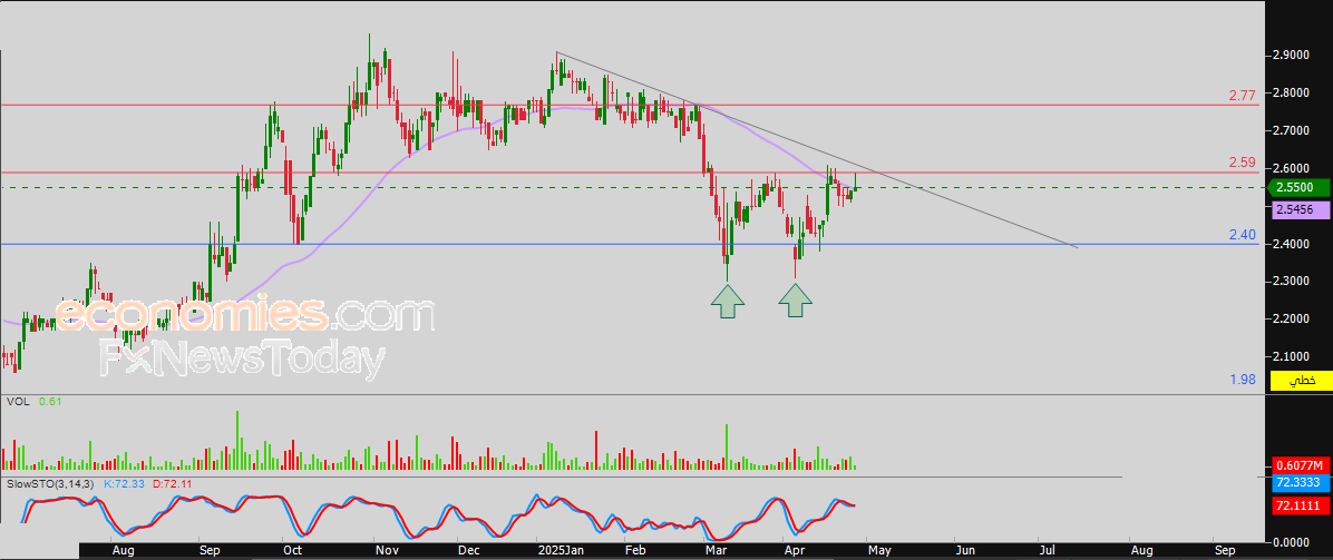 لهذا فتوقعاتنا تبقى على الحياد انتظاراً لسلوك السهم حيال مستوى المقاومة المحوري 2.59 درهم، ففي حالة اختراق تلك المقاومة يعني إعلان من السهم التعافي، ليفتح الباب أمام المزيد من المكاسب مستهدفاً أولى مستويات المقاومة عند سعر 2.77 درهم.