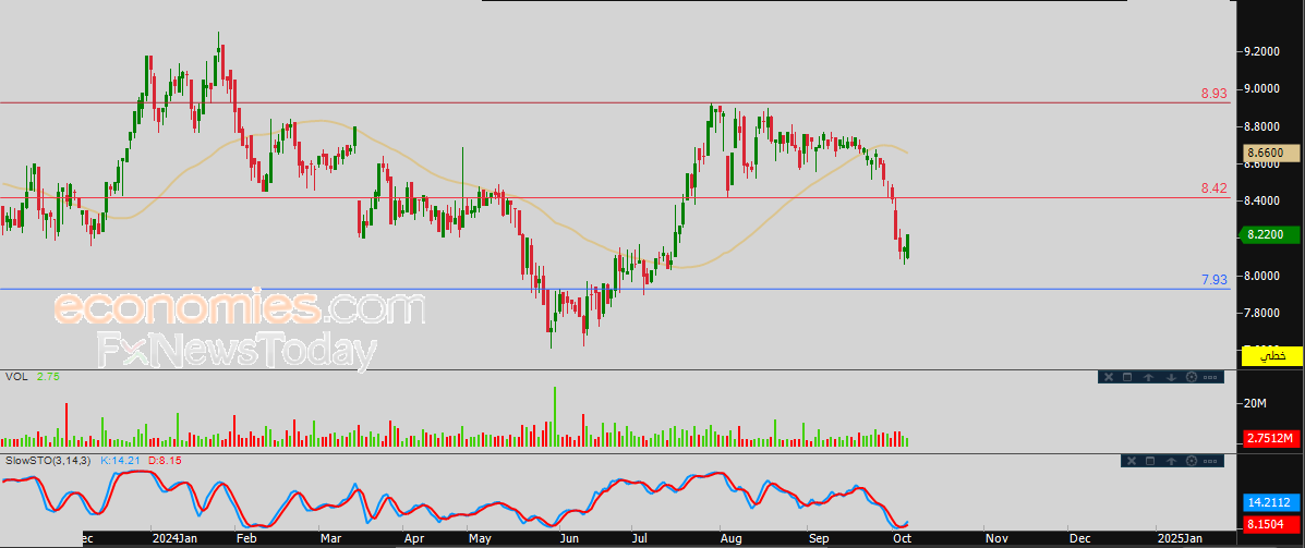 لهذا فتوقعاتنا ترجح عودة هبوط سعر السهم خلال تداولاته القادمة، طيلة ثبات مستوى المقاومة 8.42، ليستهدف أولى مستويات الدعم عند 7.93.