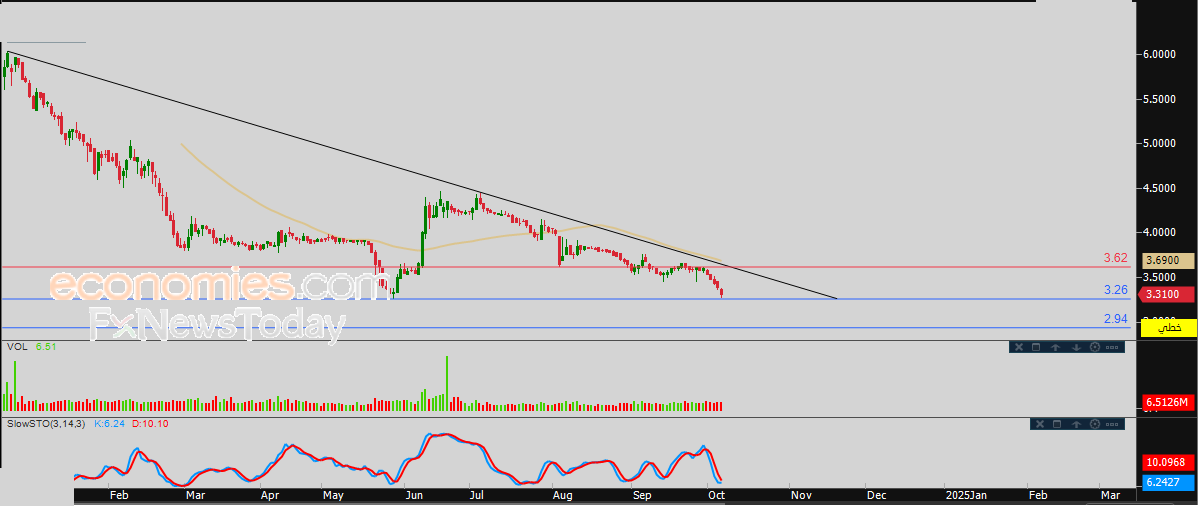 لذلك نحن نتوقع استمرار هبوط سعر السهم خلال تداولاته القادمة، خاصة في حالة كسره لمستوى الدعم 3.26، ليستهدف بعدها أولى مستويات الدعم عند سعر 2.94 درهم.