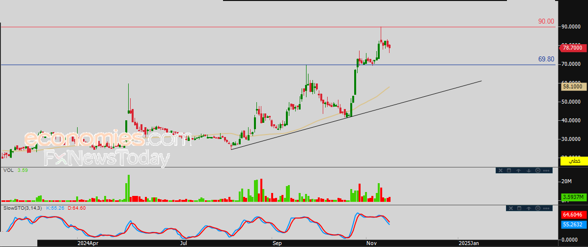 لهذا تشير توقعاتنا إلى ترجيح سيناريو عودة صعود سعر السهم خلال تداولاته القادمة، طيلة ثبات مستوى الدعم 69.80، ليستهدف من جديد مستوى المقاومة 90.00 استعداداً لمهاجمته.