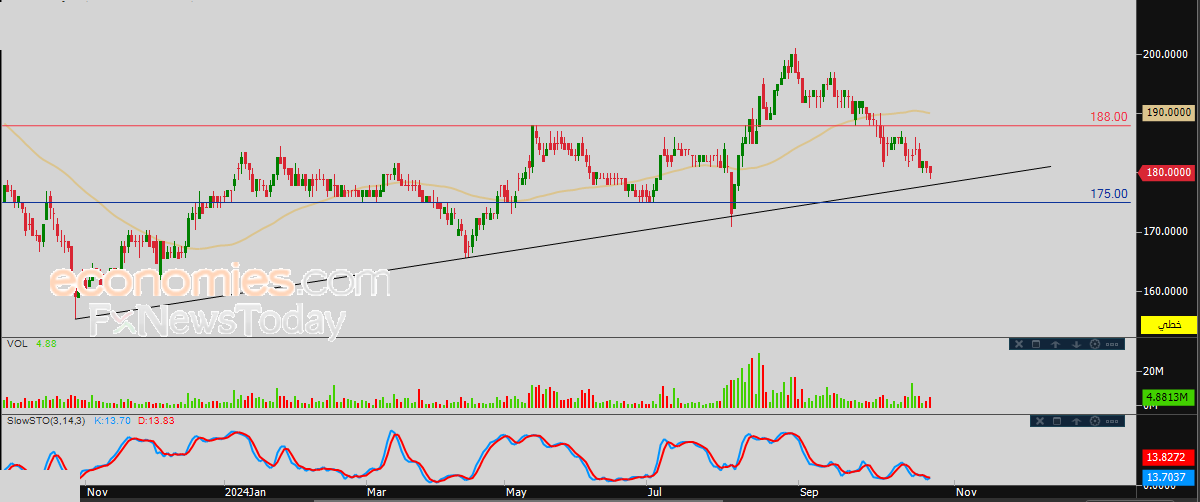 لهذا فتوقعاتنا ترجح عودة صعود سعر السهم خلال تداولاته القادمة، بشرط ثبات مستوى الدعم 175.00، ليستهدف مستوى المقاومة 188.00.
