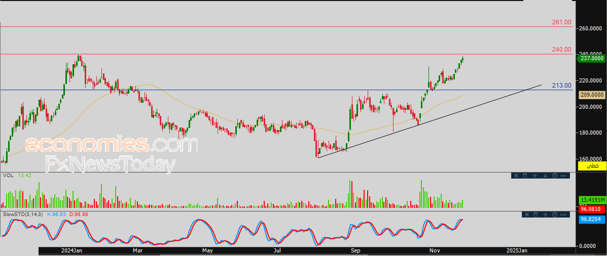 لهذا فتوقعاتنا تشير إلى استمرار صعود سعر السهم خلال تداولاته القادمة، خاصة في حالة اختراقه للمقاومة سابقة الذكر 240.00، ليستهدف بعدها مستوى المقاومة 261.00.