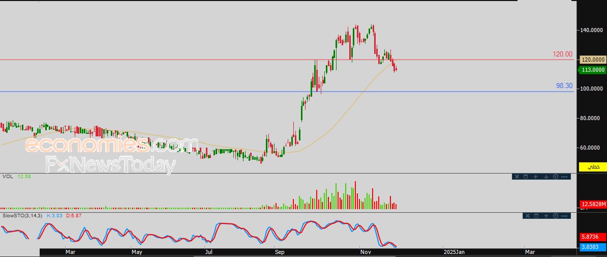 لذلك نحن نرجح عودة هبوط سعر السهم بشكل تصحيحي خلال تداولاته القادمة، طيلة استقراره دون مستوى المقاومة 120.00، ليستهدف مستوى الدعم المهم 98.30.