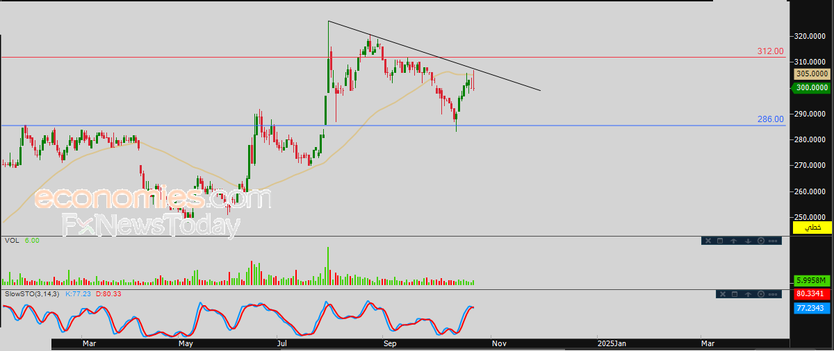 لذلك نحن نتوقع انخفاض سعر السهم خلال تداولاته القادمة، طيلة ثبات مستوى المقاومة 312.00، ليستهدف مستوى الدعم المحوري 286.00.