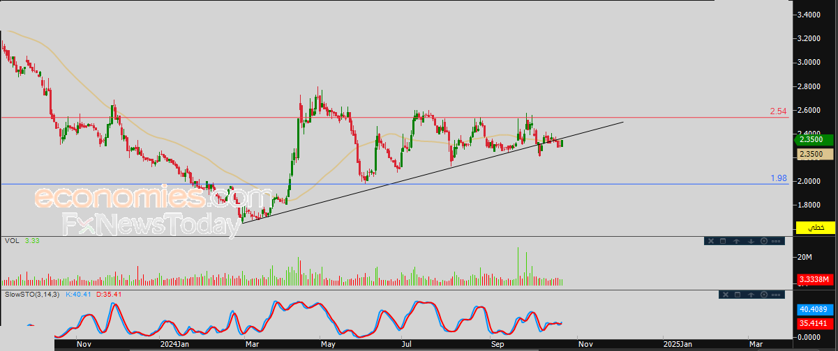لهذا نحن نرجح عودة هبوط سعر السهم خلال تداولاته القادمة، طيلة ثبات مستوى المقاومة 2.54، ليستهدف مستوى الدعم المحوري 1.98. |