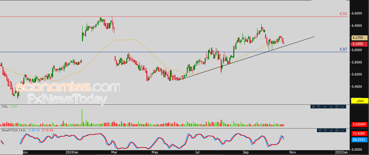لهذا فتوقعاتنا ترجح عودة صعود سعر السهم خلال تداولاته القادمة، بشرط ثبات مستوى الدعم 5.97، ليستهدف مستوى المقاومة المحوري 6.55.