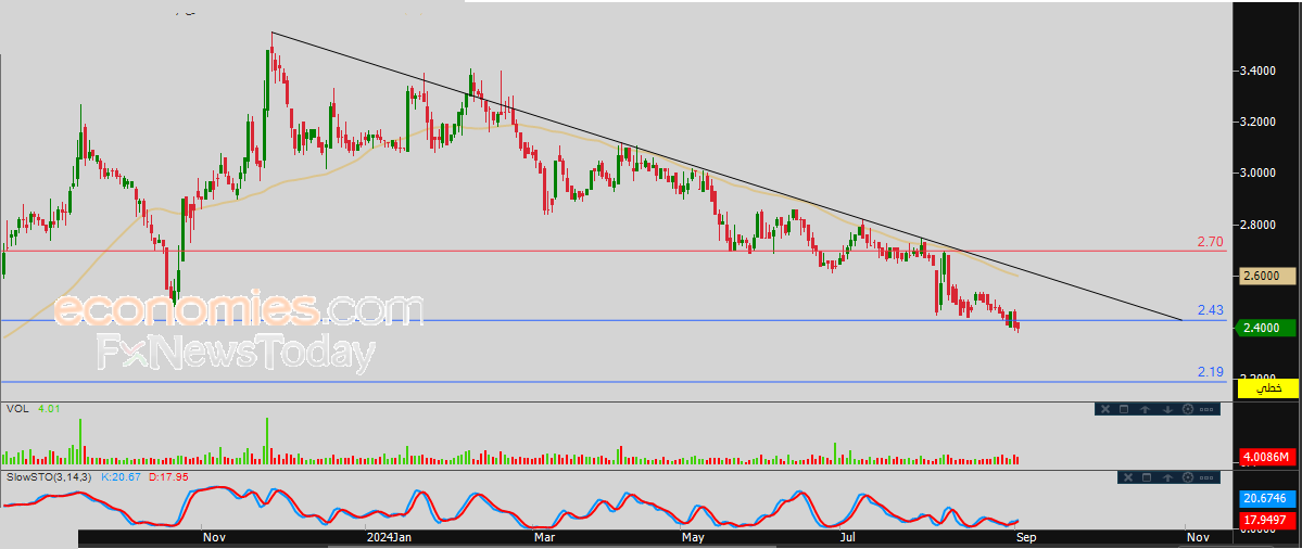 لهذا تشير توقعاتنا إلى انخفاض سعر السهم خلال تداولاته القادمة، خاصة في حالة تأكيد كسره للدعم 2.43، ليستهدف مستوى الدعم 2.20.