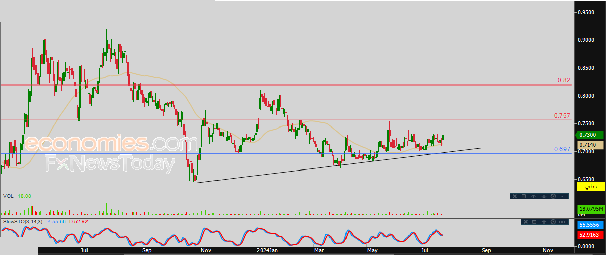 لذلك نحن نتوقع المزيد من الصعود لسعر السهم خلال تداولاته القادمة، طيلة ثبات مستوى الدعم 0.697، ليستهدف مستوى المقاومة 0.757 استعداداً لمهاجمته.