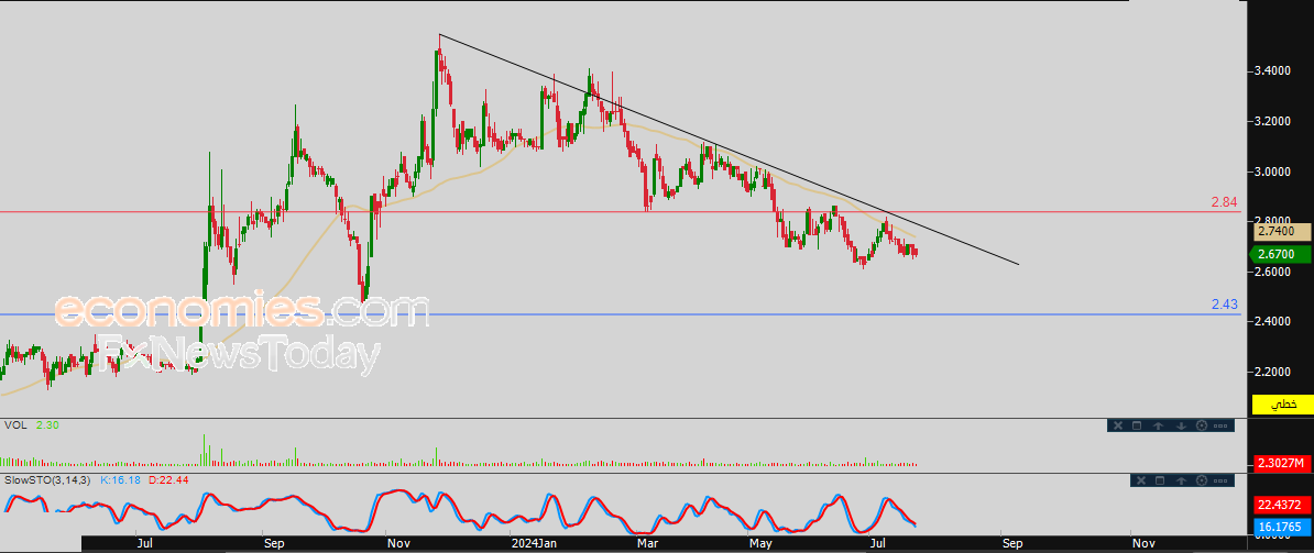 لهذا نحن نتوقع انخفاض سعر السهم خلال تداولاته القادمة، طيلة ثبات مستوى المقاومة 2.84، ليستهدف مستوى الدعم 2.43.