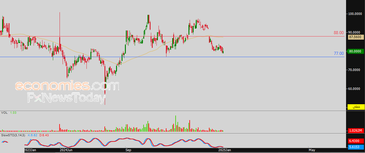 لذلك نحن نرجح عودة هبوط سعر السهم خلال تداولاته القادمة، طيلة ثبات مستوى المقاومة 88.00، ليستهدف مستوى الدعم المهم 77.00.