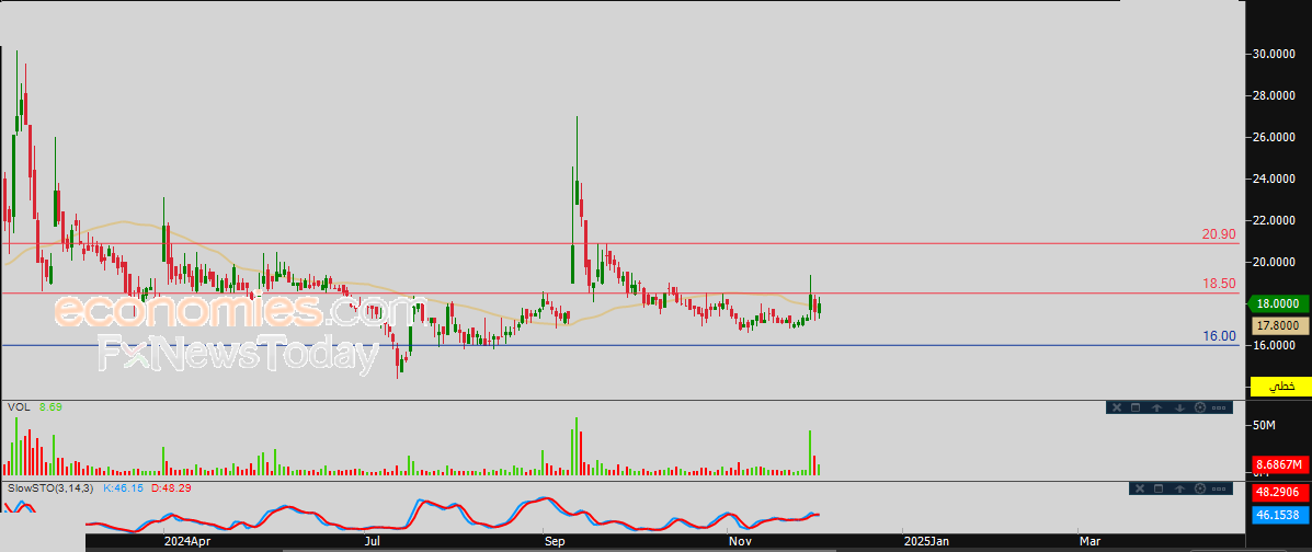 لذلك نحن نتوقع المزيد من الصعود لسعر السهم خلال تداولاته القادمة، خاصة في حالة اختراقه للمقاومة 18.50، ليستهدف بعدها اولى مستويات المقاومة عند سعر 20.90 دينار.