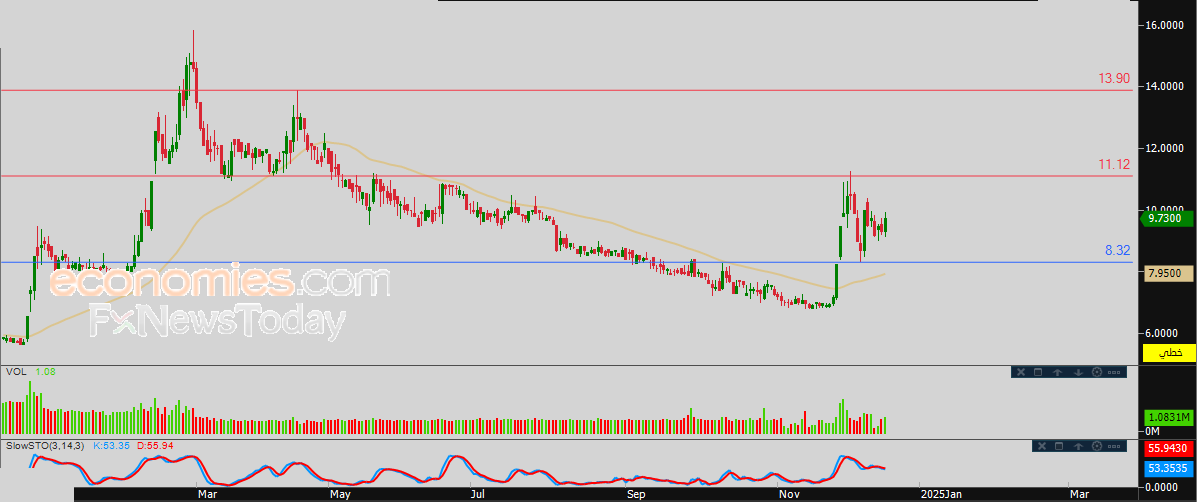 لذلك نحن نتوقع المزيد من الصعود لسعر السهم خلال تداولاته القادمة، طيلة ثبات مستوى الدعم 8.32، ليستهدف مستوى المقاومة المهم 11.12 استعداداً لمهاجمته.