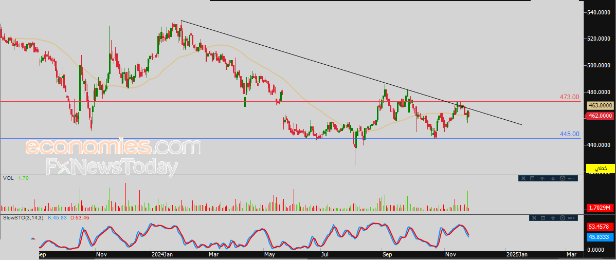 لهذا فتوقعاتنا تشير إلى المزيد من الهبوط لسعر السهم خلال تداولاته القادمة، طيلة ثبات مستوى المقاومة 473.00، ليستهدف مستوى الدعم 445.00.