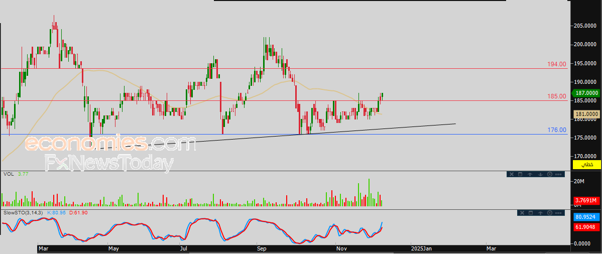 لذلك نحن نتوقع المزيد من الصعود لسعر السهم خلال تداولاته القادمة، خاصة طوال استقراره أعلى مستوى 185.00، ليستهدف أولى مستويات المقاومة عند سعر 194.00 دينار.