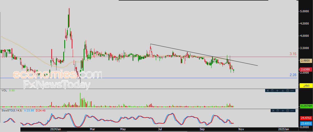 لهذا فتوقعاتنا تشير إلى المزيد من الهبوط لسعر السهم خلال تداولاته القادمة، طيلة ثبات مستوى المقاومة 3.15، ليستهدف مستوى الدعم المحوري 2.28.