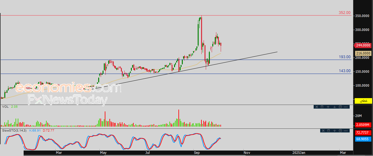 لهذا فتوقعاتنا ترجح عودة صعود سعر السهم خلال تداولاته القادمة، طيلة ثبات مستوى الدعم 193.00، ليستهدف مستوى المقاومة المحوري 352.00.
