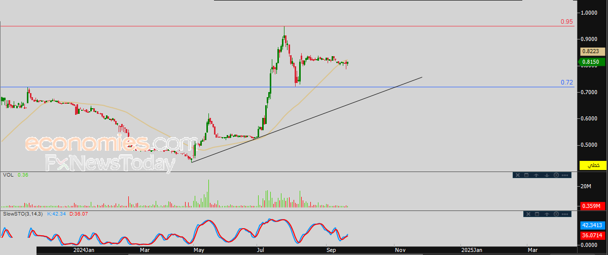 لهذا تشير توقعاتنا إلى المزيد من الصعود لسعر السهم خلال تداولاته القادمة، طيلة ثبات مستوى الدعم 0.72، ليستهدف مستوى المقاومة المحوري 0.95.