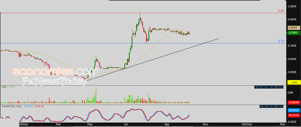 لذلك نحن نتوقع ارتفاع سعر السهم خلال تداولاته القادمة، بشرط ثبات مستوى الدعم 0.72، ليستهدف مستوى المقاومة المحوري 0.95.
