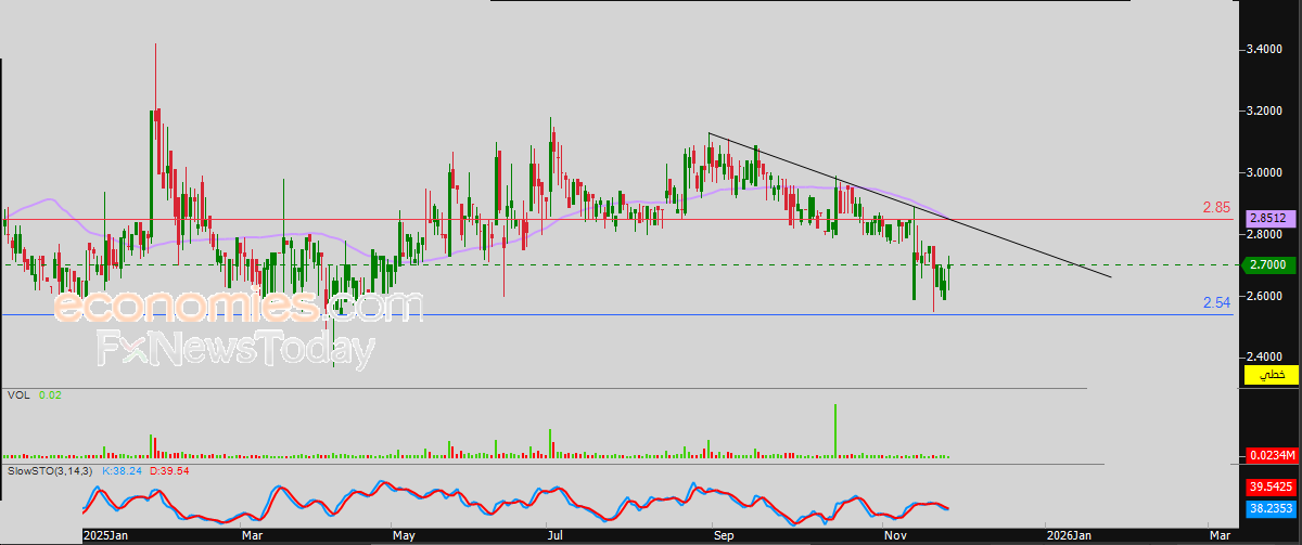 لهذا فتوقعاتنا تميل نحو هبوط سعر السهم من جديد خلال تداولاته القادمة، طيلة ثبات مستوى المقاومة 2.85 درهم، ليستهدف مستوى الدعم المحوري 2.54 درهم.