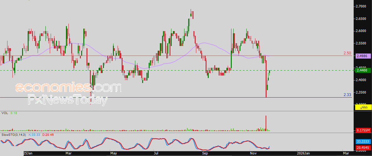 لذلك فتوقعاتنا تميل نحو هبوط سعر السهم خلال تداولاته القادمة، طيلة ثبات مستوى المقاومة 2.50 درهم، ليستهدف مستوى الدعم المحوري 2.33 درهم.