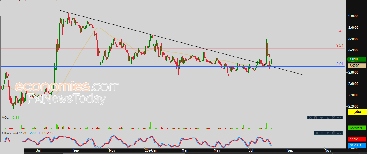 لهذا نحن نتوقع المزيد من الصعود لسعر السهم خلال تداولاته القادمة، طيلة ثبات مستوى الدعم 2.90، ليستهدف مستوى المقاومة 3.50.