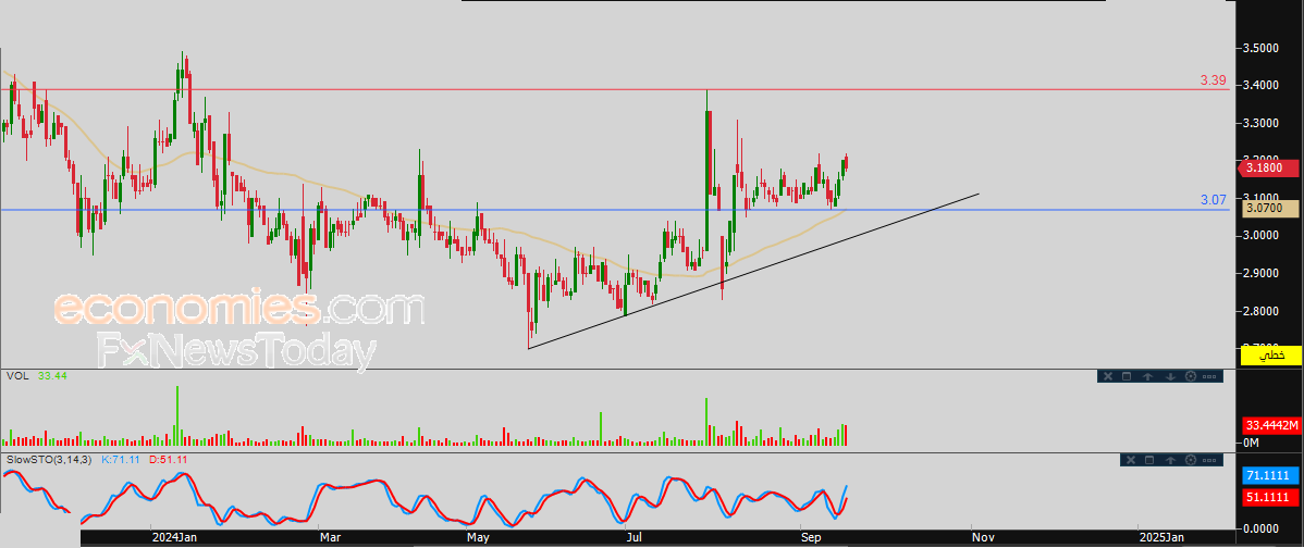 لهذا نحن نرجح عودة صعود سعر السهم خلال تداولاته القادمة، طيلة ثبات مستوى الدعم 3.07، ليستهدف مستوى المقاومة 3.30.