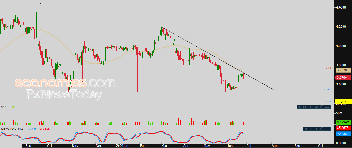 لهذا تشير توقعاتنا إلى المزيد من الهبوط لسعر السهم خلال تداولاته القادمة، طيلة ثبات مستوى المقاومة 3.741، ليستهدف مستوى الدعم المحوري 3.523.