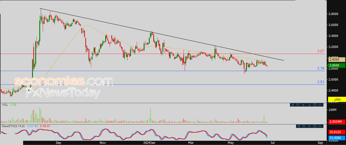 لهذا نحن نرجح عودة هبوط سعر السهم خلال تداولاته القادمة، طيلة ثبات مستوى المقاومة 3.00، ليستهدف مستوى الدعم المحوري 2.75.