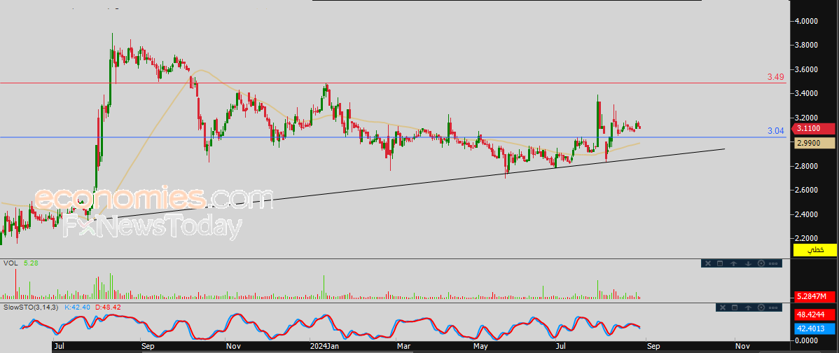 لذلك تشير توقعاتنا إلى ترجيح سيناريو عودة صعود سعر السهم خلال تداولاته القادمة، طيلة ثبات مستوى الدعم 3.00، ليستهدف مستوى المقاومة المحوري 3.50.