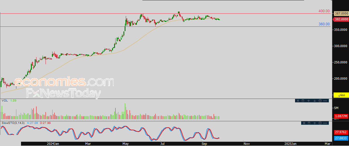لذلك نحن نتوقع انخفاض سعر السهم خلال تداولاته القادمة، طيلة ثبات مستوى المقاومة المحوري 400.00، ليستهدف مستوى الدعم 360.00.