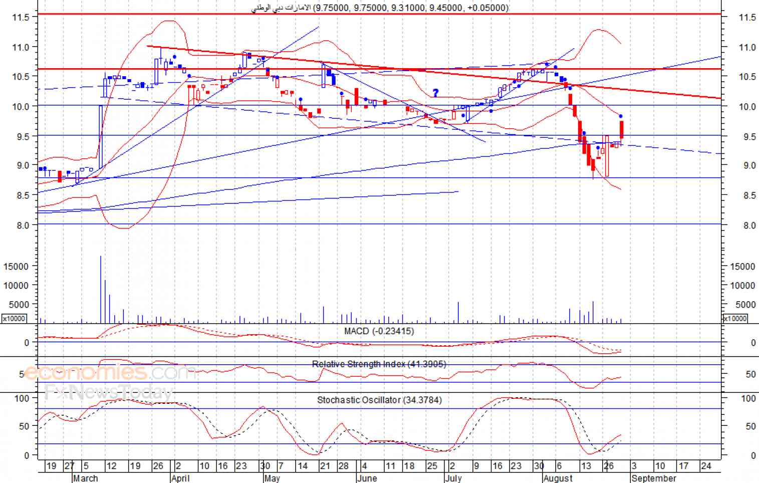 استهل السهم تداولات الخميس الماضي مرتفعا بشكل كبير عند مستوى 9.75 درهم، مقتربا بذلك من متوسطه المتحرك لـ 20 يوم، والذي يشكل مقاومة دفعت السهم لأسفل ليقلص مكاسبه ويغلق عند مستوى 9.45 درهم، مرتفعا بشكل طفيف مقارنة باغلاقه السابق، وفي ظل ملامسا السهم لمستوى المقاومة الحالي عند 9.50 درهم، شرط ثبات السهم أسفل مستوى 9.75 درهم.