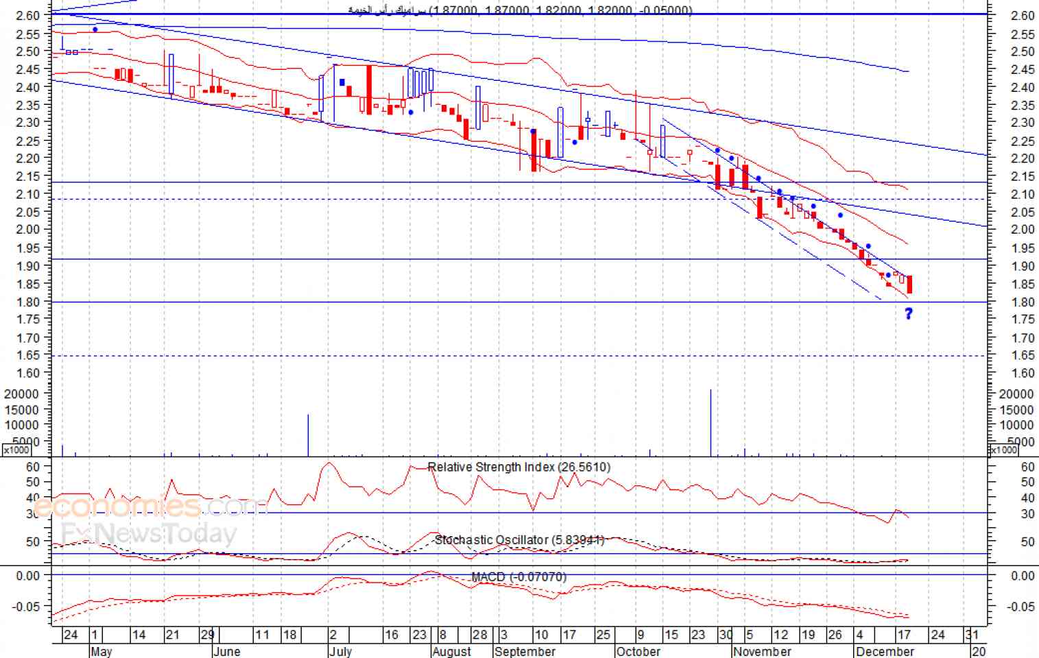 عمق السهم من خسائره كما أشرنا في تقاريرنا السابقة منذ بداية الشهر الماضي، حيث اغلق أمس الأربعاء عند مستوى 1.82 درهم، مسجلا ادنى مستوى خلال الجلسة وأيضا منذ شهر يوليو من عام 2013، مما يعكس ارتفاع حالات التشاؤم لدى التداولين، ويواجه السهم حاليا هدفه السعري المتوقع عند 1.80 درهم والذي يشكل الدعم الحالي، وفي حالة اختراقه فسيواصل السهم تراجعه لمستوى الدعم التالي عند 1.65 درهم.