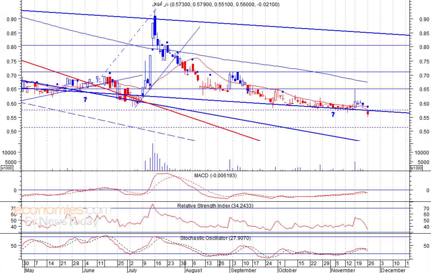 ومن المتوقع ان يكون النطاق السعري خلال جلسة اليوم بين مستوى الدعم هو 0.54 درهم وبين مستوى المقاومة هو 0.58 درهم